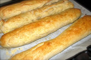 10. Remember you’re making bread, take the baguettes out of the oven, turn the oven ON to 450 degrees Fahrenheit, then give the baguettes and egg wash. (An egg wash is watered down egg yolk.  It makes things golden.)
